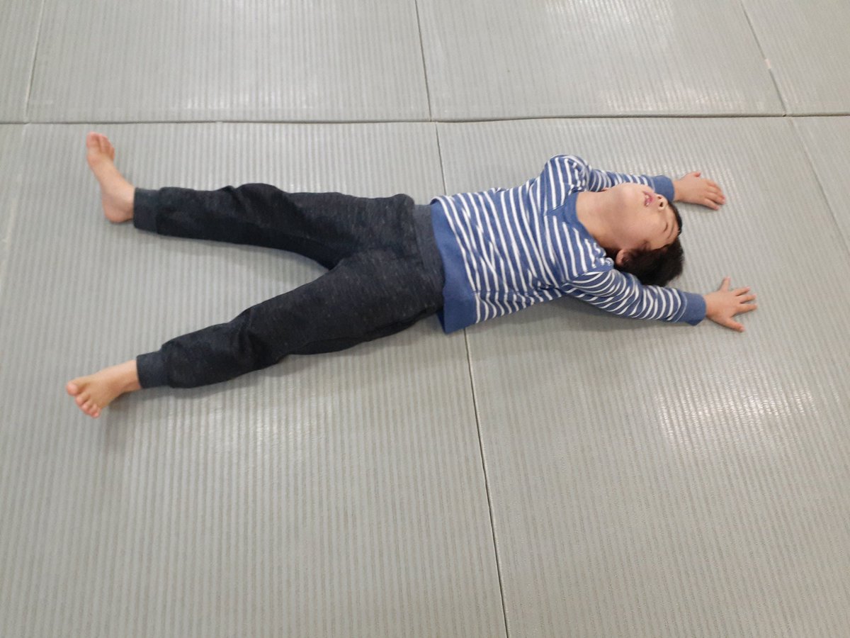 柔道練習。連れてきた息子が準備運動だけ参加。見たことがないポーズをしていたので写真を撮らせてもらいました。仰向けのはずが肩から先だけうつ伏せ?!大人たちには出来ないポーズでした。練習後にスポンジ剣でやったチャンバラごっこが楽しかったみたいです。 pic.twitter.com/q7LiGxWT1a