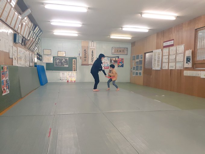 柔道練習。道場は今日で稽古納め。最後に天井、壁、畳を掃除して終了!写真は展示物を片付けて広くなった道場でOBのお姉さんにソフト剣で遊んでもらう息子。今年もありがとうこざいました! pic.twitter.com/D725lgTM81